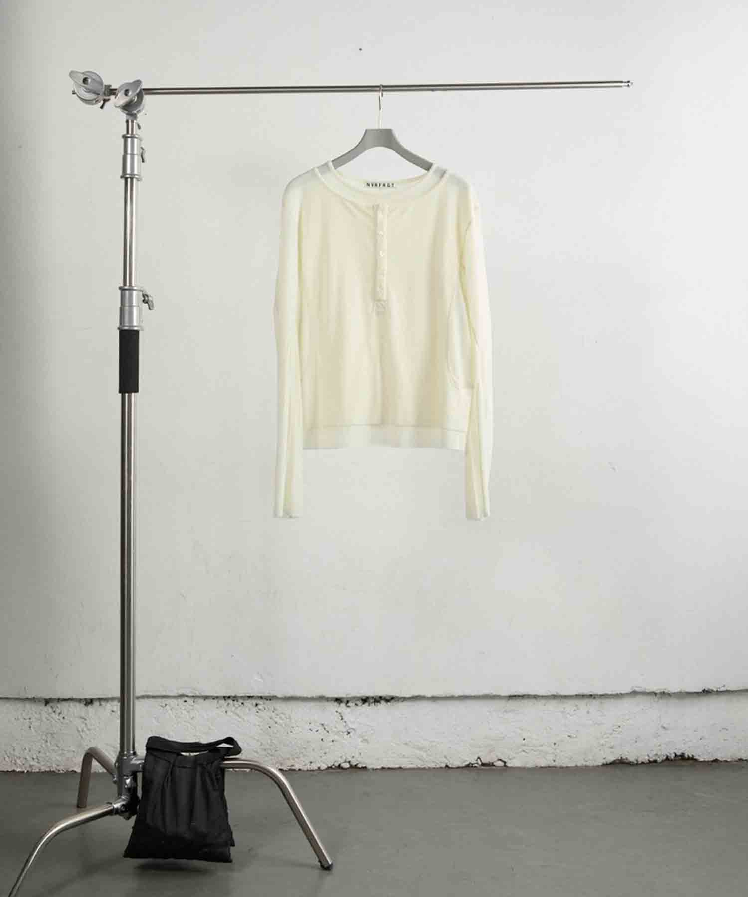 デザイン ウールナイロンジャーガードによる透け感のある素材を使用。 身頃を二重にしたレイヤード仕立てロングスリーブヘンリーネックTシャツ。 ピヴォットスリーブとセンターバックシームによる独自構造。 広めの衿ぐりでレイヤードされたネックデザインが特徴。 フラットシーマー縫製にヘムラインはカットオフ仕立て。 天然貝釦使用。 洗濯可能でワンウォッシュタンブラー処理を施しているため洗濯後も縮みなく着用できます。 推奨サイズ 身長~174cm:1 身長175cm~:2 素材 ・裏地:なし ・伸縮性:なし ・洗濯表記:洗濯機洗い可能 メーカー品番:NF252T06 -NVRFRGT- “禅における不忘念(フモウネン)の精神とアイデンティティーの多様性”をコンセプトに掲げ、 一過性のモノではなくワードローブに深く根差すモノ創りを目指す。 独自のパターンカットを基に生み出される洗練性と実験的且つユニークなデザインのアプローチによるデイウェア。 ※店舗と在庫を共有しておりますので、受注確認メールが届いてもご注文のタイミングによりましては売り切れになる可能性がございますので、予めご了承ください。 ※商品の色味につきまして、撮影環境、お客様のお使いのPCのモニター環境により実際のカラーと画像の色味が違って見える場合が御座います。