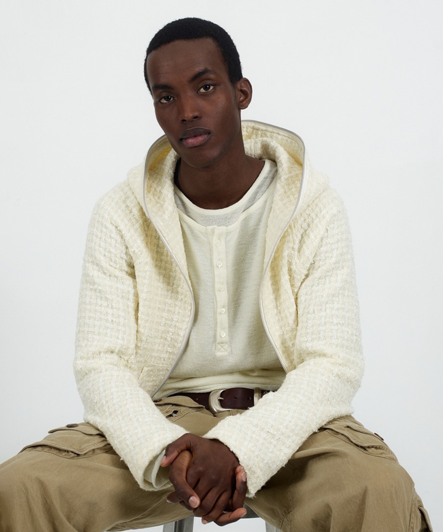 デザイン スラブネップツイードを使用したフルジップアップフーディー。 控えめなラメ糸使いがアクセントになっています。 変形ピヴォットラグランスリーブにカーヴィーなパネリングデザイン。 ダブルオープンアルミジッパーフロント。 ファスナープルコード先端にはオニキスやピクチャージャスパー天然石ビーズ装飾。 推奨サイズ 身長~174cm:サイズ1 身長175cm~:サイズ2 素材 ・裏地:なし ・伸縮性:なし ・洗濯表記:ドライクリーニング メーカー品番:NF252J09 -NVRFRGT- “禅における不忘念(フモウネン)の精神とアイデンティティーの多様性”をコンセプトに掲げ、 一過性のモノではなくワードローブに深く根差すモノ創りを目指す。 独自のパターンカットを基に生み出される洗練性と実験的且つユニークなデザインのアプローチによるデイウェア。 ※店舗と在庫を共有しておりますので、受注確認メールが届いてもご注文のタイミングによりましては売り切れになる可能性がございますので、予めご了承ください。 ※商品の色味につきまして、撮影環境、お客様のお使いのPCのモニター環境により実際のカラーと画像の色味が違って見える場合が御座います。