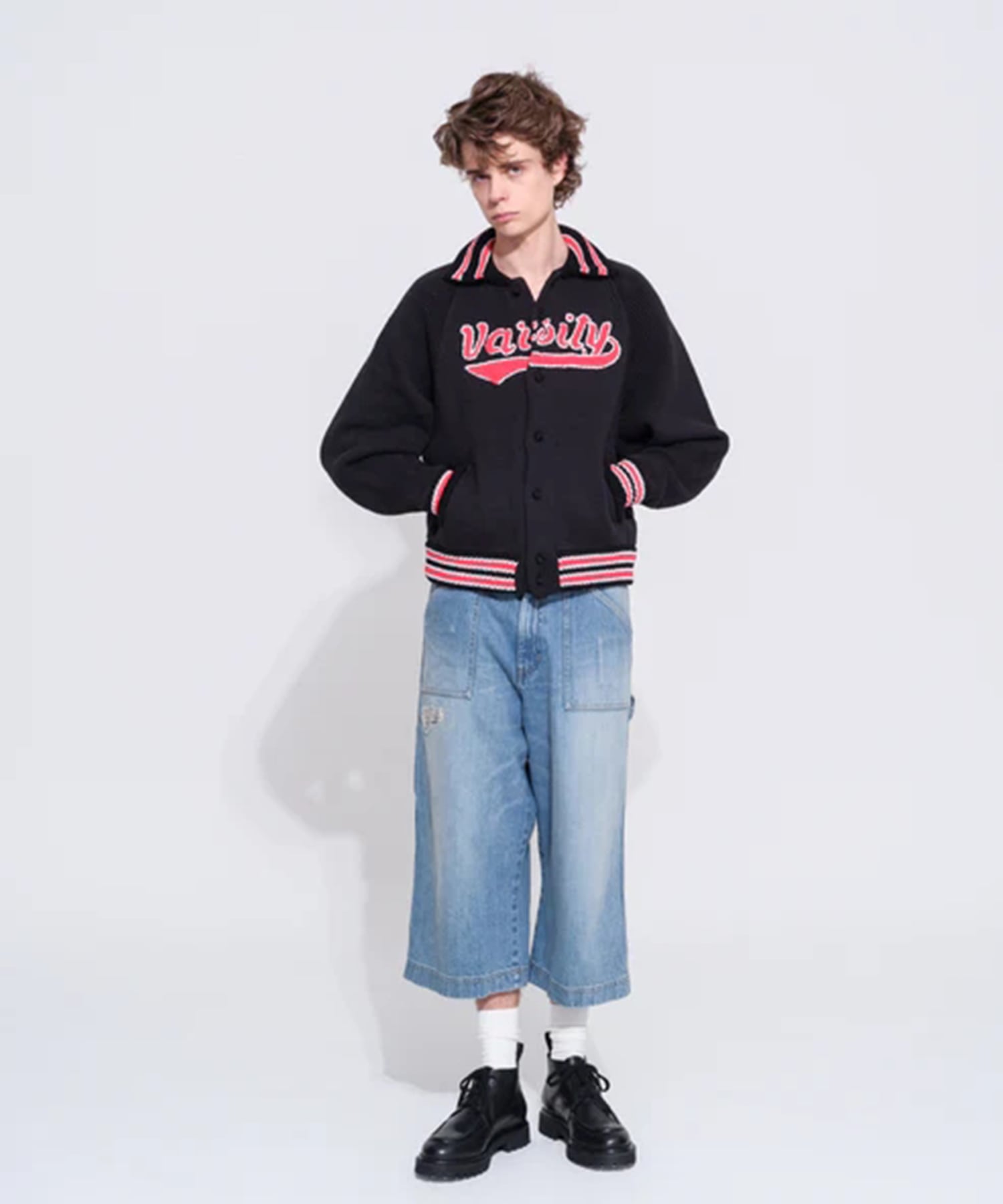 バーシティジャケットのディテールを、さまざまなニッティング技法で表現したニットジャケット。
