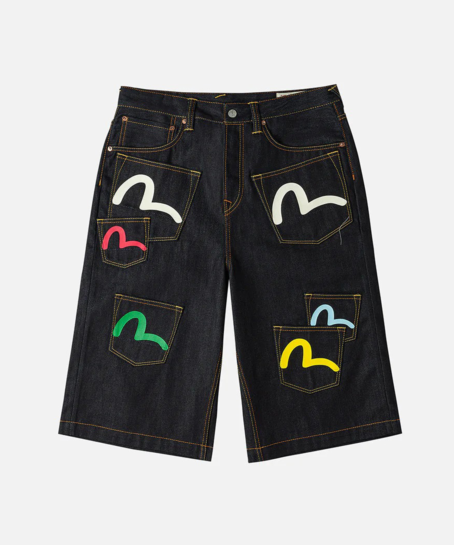 Express individuality and style with EVISU denim shorts. Crafted from heavyweight denim, each pocket is accented with vibrant seagull prints, adding an energetic touch to summer looks. Both fashionable and functional, they are the perfect choice for confident self-expression.