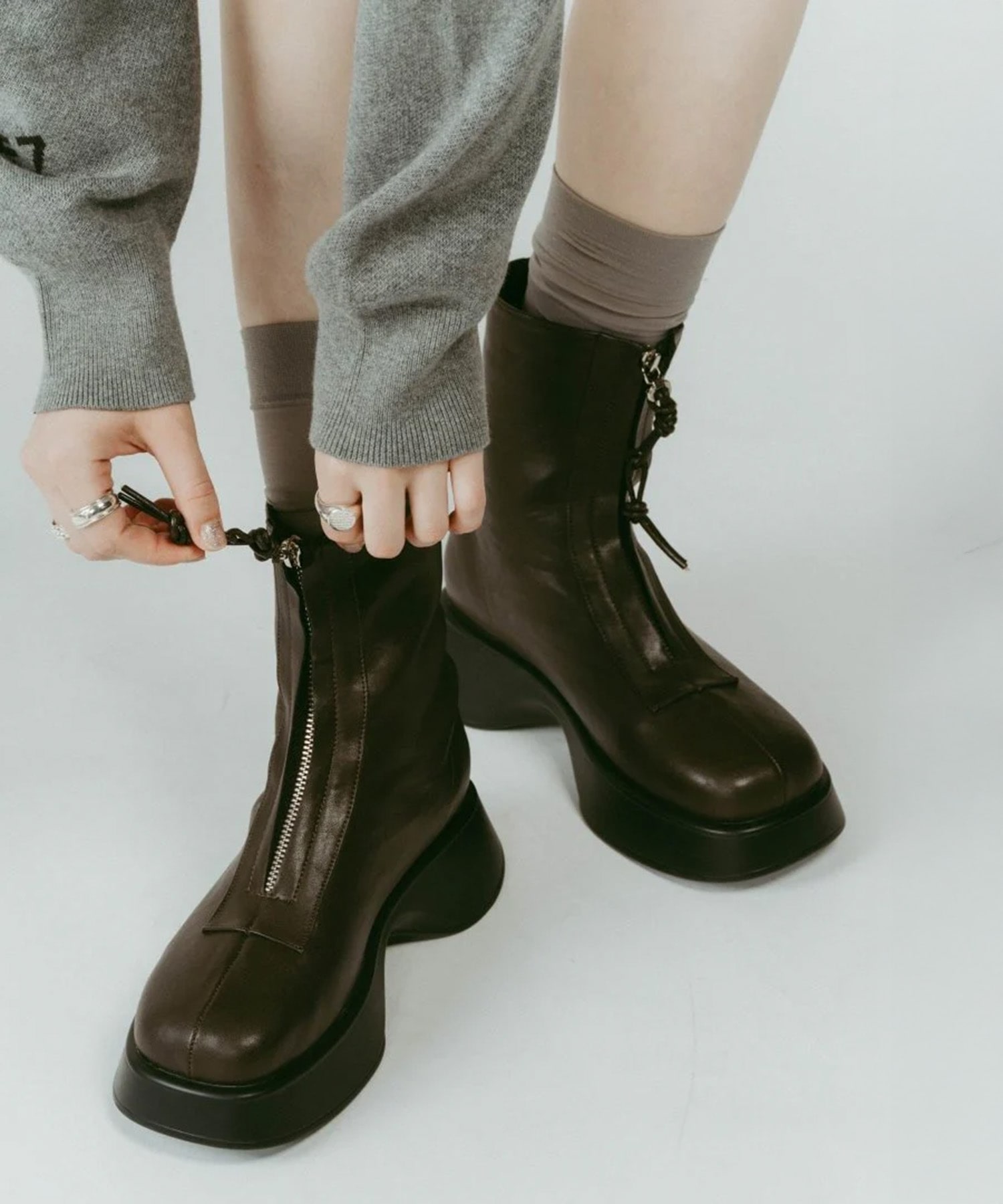 デザイン 無駄を削ぎ落としたミニマルなシルエットに、フロントジップと結び目のディテールが静かな主張を添えるブーツ。 ぽてっとしてマニッシュな雰囲気のトゥフォルム、足元に安定感とモードな印象をプラス。 それとは対照的にくびれたレッグで気取らず美脚も狙える。 マットなレザーの質感がどんなスタイルにも自然に馴染みながら、全体をきゅっと引き締めてくれる。 メーカー品番:KM25WE01 -Knuth Marf - ディレクター:ChiEmi New Clothes, New Me. 心地よい響きを身に纏い 新たな世界へ旅立つ ” 新しい自分を探す旅先 ”でKnuth Marfを訪れ、胸がときめくような新しい自分と出会う。 トレンドに沿った衣服だけではなく、一癖あるデザインを生み出すことで、ジェンダーレスな商品を多数展開 ※店舗と在庫を共有しておりますので、受注確認メールが届いてもご注文のタイミングによりましては売り切れになる可能性がございますので、予めご了承ください。 ※商品の色味につきまして、撮影環境、お客様のお使いのPCのモニター環境により実際のカラーと画像の色味が違って見える場合が御座います。